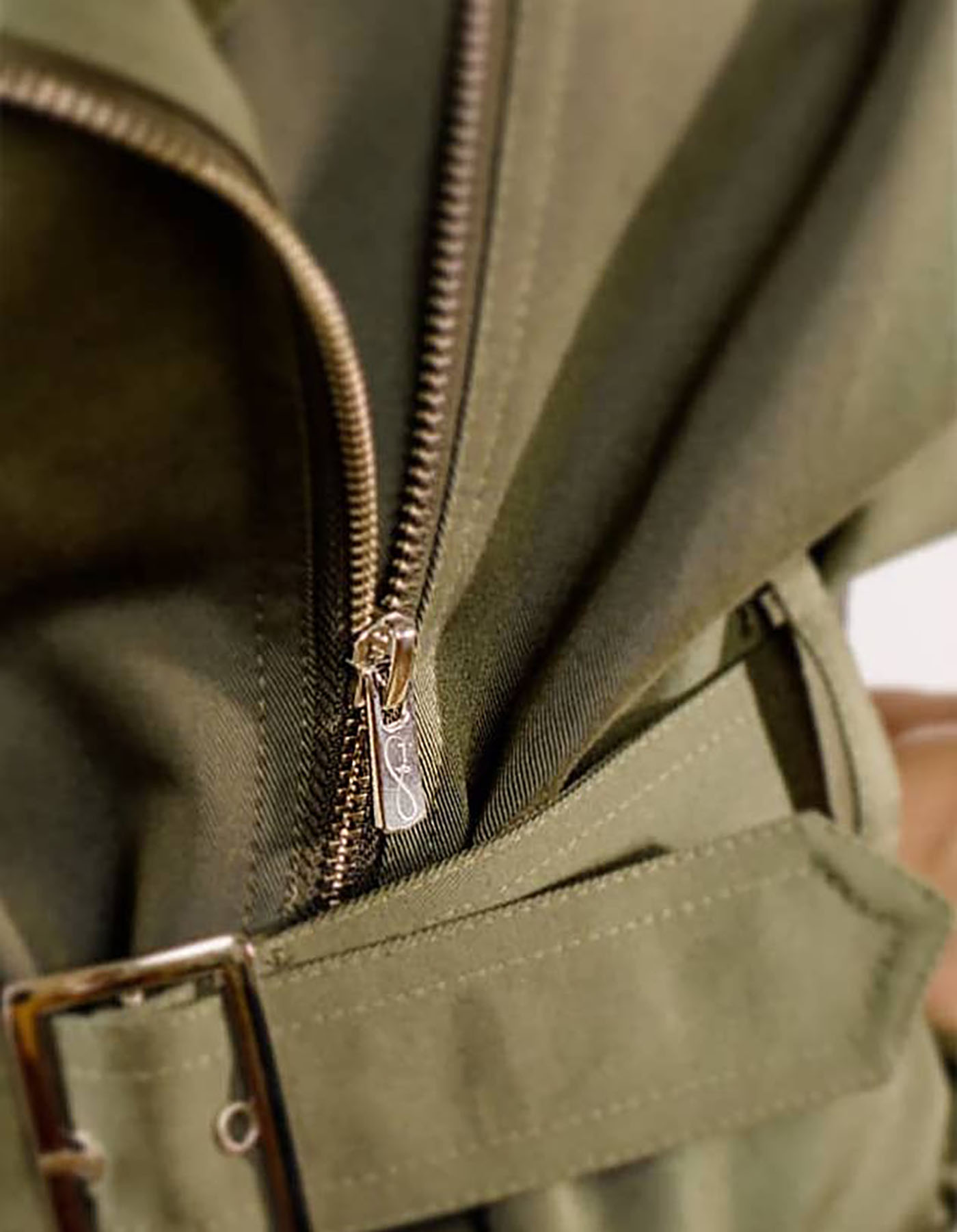 Avec sa coupe saharienne et ses poches XXL, Meryl est la pièce essentielle du vestiaire des indomptables. Oversize, mais resserrée à la taille par une ceinture à la boucle argentée élégante, elle sculpte une silhouette féminine et libre de se mouvoir. D’un kaki légèrement satiné qui se fond dans la jungle urbaine, elle vous protège des intempéries grâce à son tissu en coton biologique déperlant. Sous la carapace de prédatrice se cache une doublure 100% végétale en ode à l’amour, réalisée en exclusivité par l’illustratrice Elise Enjalbert. Peau contre peaux, sans jamais heurter un autre être vivant, Meryl accompagne les audacieuses qui ont du cran, les volontaires au style pointu et assumé.